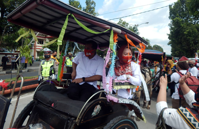 Purbalingga, gatra.net - Pasangan bakal calon Bupati-Wakil Bupati Dyah Hayuning Pratiwi-Sudono (Tiwi-Dono), mendaftar ke Komisi Pemilihan Umum (KPU) Purbalingga, Jumat (4/9) sore. Mereka menaiki andong dengan diantar kader partai pengusung, massa pendukung simpatisan maupun relawan.