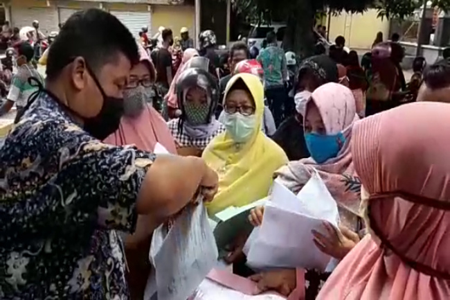 Rembang, gatra.net - Ribuan warga di Kabupaten Rembang Jawa Tengah memadati Kantor Dinas Perindustrian Perdagangan dan Koperasi Usaha Kecil dan Menengah, Rabu (21/10). Kedatangan mereka untuk mengurus bantuan UMKM dari Kementrian UMKM. Banyaknya warga yang datang menimbulkan kerumuman massa, padahal pendaftaran dibuka secara online.