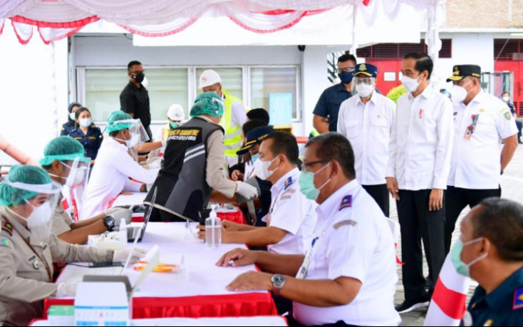 Presiden Joko Widodo (Jokowi) dalam agenda kunjungan kerjanya, turut meninjau pelaksanaan vaksinasi massal tersebut. Sekira 50 orang tengah mengikuti jalannya proses vaksinasi saat Presiden tiba di lokasi.