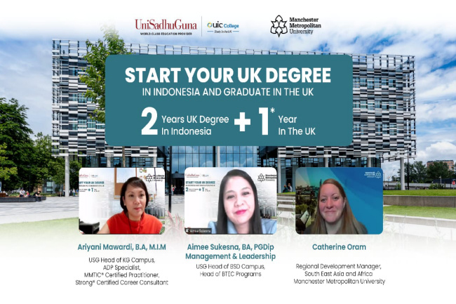Jakarta, gatra.net- USG Education bersama Manchester Metropolitan University (MMU), United Kingdom (UK) buka Program Pathway US Education, yaitu UIC College - MMU dimana untuk menyelesaikan gelar Bachelor (s1), siswa atau siswi dapat bertransisi ke perkuliahan jenjang internasional dengan waktu lebih singkat.