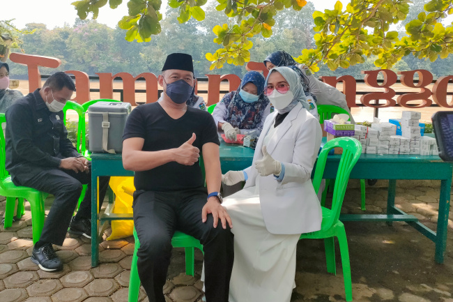 Tebo, Gatra.com- Bupati Tebo, Sukandar dan Ketua DPRD Tebo, Mazlan menerima suntikan vaksin booster. Vaksin dosis ketiga Covid-19 ini disuntikkan oleh petugas Puskesmas Tebo Tengah saat memperingati Hari Peduli Sampah Nasional Tahun 2022, di Taman Tanggo Rajo, Kelurahan Muara Tebo, Kecamatan Tebo Tengah, Kabupaten Tebo, Jambi, Senin (21/02).