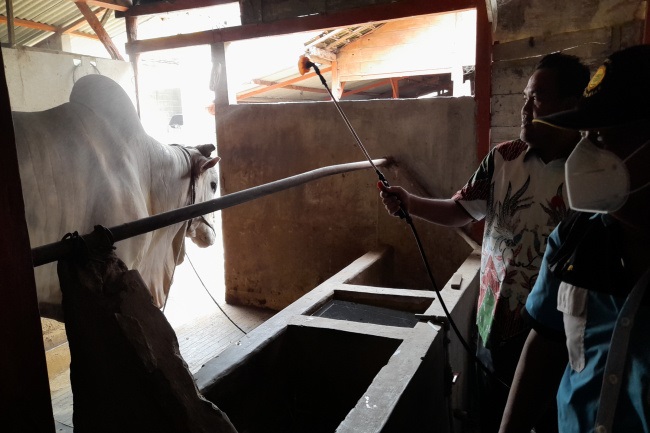 Blora, gatra.net - Kabupaten Blora Jawa Tengah saat ini masih zero dari wabah Penyakit Mulut dan Kuku (PMK). Berbagai upaya terus dilakukan untuk mencegah masuknya wabah tersebut. Salah satunya dengan penyemprotan cairan disinfektan terhadap sapi maupun kandang.