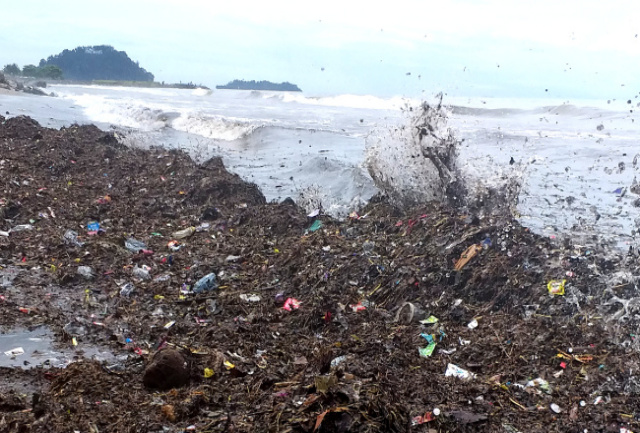 Mirisnya, sampah dengan tinggi sekitar 1,5 meter itu bukan hanya menumpuk dan berserakan di bibir pantai, tapi juga mengambang dalam gulungan ombak. Warna air laut sekitar bibir pantai tampak berwarna menghitam pekat, dan berbau tak sedap.