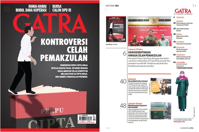 Laporan utama edisi kali ini mengenai kontroversi celah pemakzulan. Berawal dari kegentingan hingga celah pemakzulan, penerbitan Perpu Cipta Kerja dianggap akal-akalan untuk bisa melanjutkan UU Cipta Kerja yang diminta perbaikannya oleh MK. Ditolak banyak pihak, bisa berakibat pemakzulan presiden.