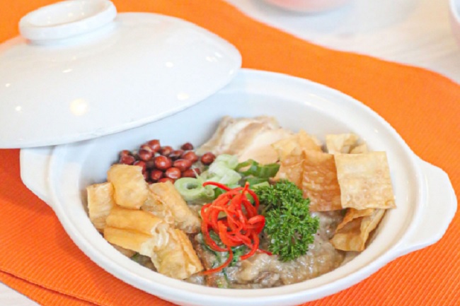 Bubur yang sudah digoreng kemudian disajikan dengan toping ayam fillet, cakwe, sayuran, pangsit, dan kacang. Metode penggorengan menggunakan wok tersebutlah yang membuat aroma bubur menjadi lebih sedap, dengan cita rasa yang lebih gurih.