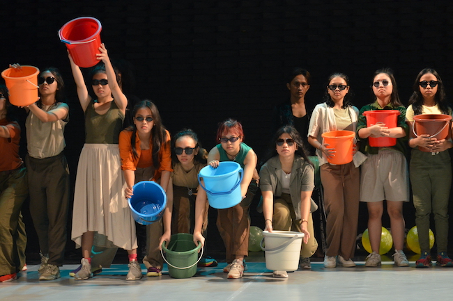 Lalu panggung dimasuki banyak orang dan memunculkan kesan bahwa panggung itu adalah ruang publik kota. Seperti taman kota atau lapangan olahraga di sebuah perkampungan. Beragam manusia hadir di sana, mulai dari anak-anak hingga kreator konten yang selalu sibuk live streaming melalui ponselnya.